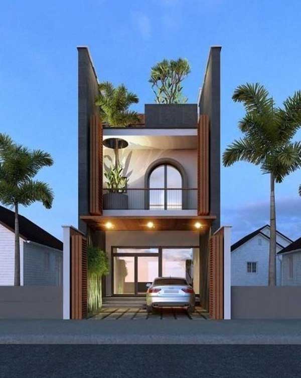 Một ngôi nhà kết hợp giữa phong cách hiện đại và cổ điển mang lại cảm giác thích thú khi nhìn trực quan. Thiết kế cao tầng nhưng vân mang lại cảm giác cân dối vì phần tầng 1 cùng hệ thống tường rào kiên cố. Phần cửa được thiết kế tie mỉ nên ngôi nhà trở nên sang trọng và khiến ngôi nhà có chiều sâu hơn. Phấn mái thiết kế theo các ô vương cùng giàn leo nên ngôi nhà như được bao phủ bởi màu xanh của cây cối. Đây là biện pháp khắc phục những gia đình không có sân vườn.