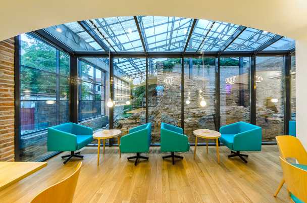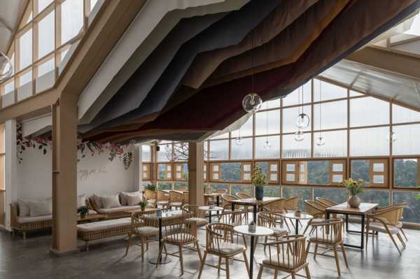 4.4 Thiết kế quán cafe bằng kính đẹp nhờ sử dụng giếng trời