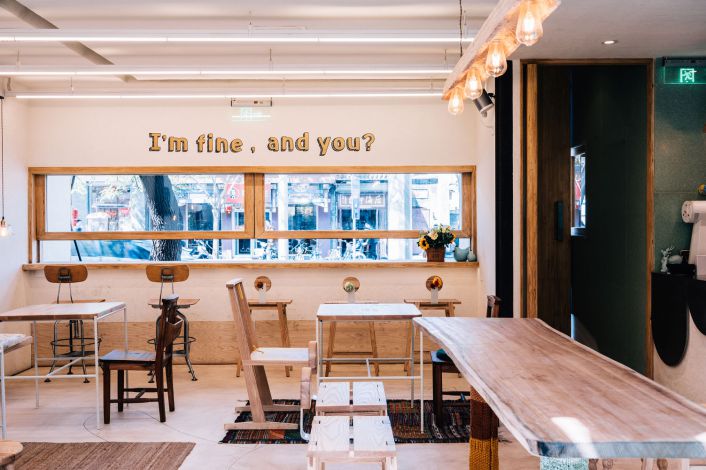 Thiết kế nội thất đơn giản từ quầy pha chế cho đến bàn ghế khách uống cafe hay cửa ra vào. Tất cả đều được thiết kế đơn giản kết hợp với tông màu sáng, giúp không gian quán rộng rãi và thông thoáng hơn. Yếu tố ánh sáng của quán cũng được thiết kế rất linh hoạt. cùng với ánh sáng từ hệ thống đèn, quán còn tận dụng ánh sáng tự nhiên thông qua lớp của kính. Điều này đã tô điểm và khiến cho nội thất quán độc đáo, nổi bật và khác biệt so với những quán cafe khác. Ngoài ra, quán sử dụng các chi tiết trang trí độc đáo và là, đó là những thiết kế handmade cùng với tranh vẽ, cây xanh, kệ trang trí…