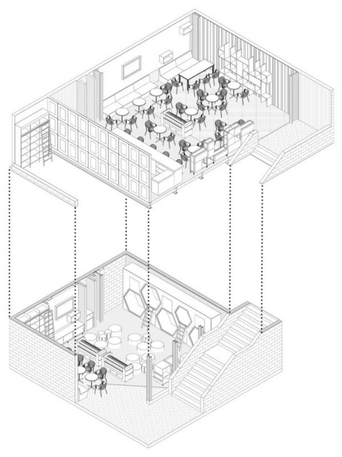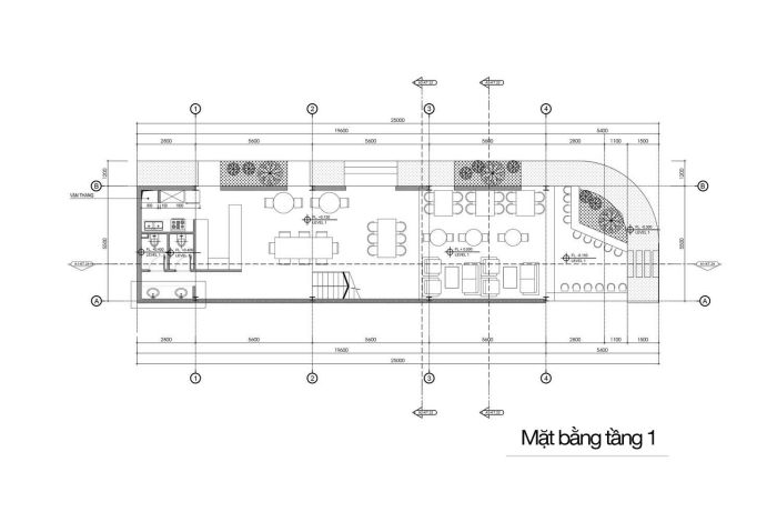 Nhìn vào bản vẽ này, chúng ta có thể thấy tầng 1 được thiết kế bao gồm không gian bên trong và bên ngoài với nội thất phù hợp. Ngoài ra còn có khu vực của quầy bar, cây xanh với nhằm mang đến không gian tươi mới và làm dịu nhẹ sự thô cứng của công trình. Hơn nữa, cầu thang được thiết kế bằng hệ khung thép vững chắc.