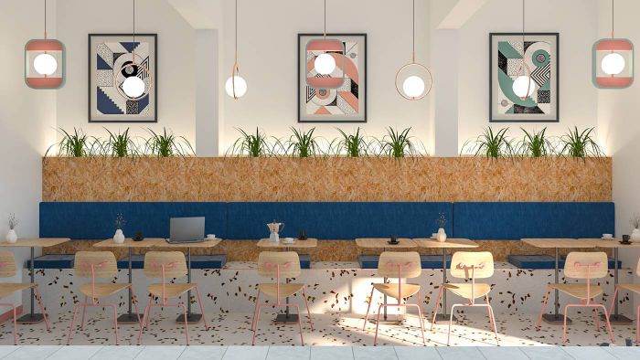 Ấn tượng đầu tiên của mẫu thiết kế quán cà phê diện tích 60m2 này chính là gam màu tươi sang. Trên nền của tông màu trắng, các tông màu xanh dương, hồng nhạt, vàng… được cận dụng đặc sắc, cuốn hút. Nội thất của quán đặc trưng với kích thước nhỏ, tiền lợi. Không hướng đến sự sang trọng như nhiều quán cafe khác, mẫu cafe này tạo sự gần gũi, thân quen.