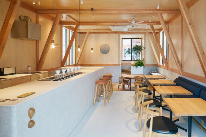 Khu vực quầy bar được thiết kế sang trọng, làm từ đá trắng nhân tạo. Đây chính là điểm nhấn nổi bật của theiét kế cà phê đẹp này. Giữa không gian ấm áp được làm từ chất liệu gỗ, nổi bật lên bởi tông trắng nhẹ nhàng. Một vài chiếc ghế gỗ tròn cao được bố trí xung quanh quầy bar để khách đi iý người có thể ngồi. Một điểm cuốn hút của quán cà phê này là tông màu gỗ chủ đạo mang lại sự ấm cúng khi kết hợp với ánh đèn vàng. Đây sẽ trở thành địa điểm tụ tập thú vụ của giới trẻ mỗi dịp cuối tuần.