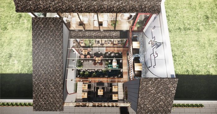 Mẫu thiết kế quán cafe này sẽ khiến bao người lụi tim nhờ phong cách độc đáo và view thông thoáng. Chính sự kết hợp thông minh giữa không gian ngoài trời và trong nhà tạo cho khách thêm nhiều sự lựa chọn. Mỗi loại bàn ghế được bố trí phù hợp với mỗi không gian khác nhau tạo cảm giác thoải mái khi khách hàng thưởng thức cafe. Điểm đặc biệt của quán cafe này chính là hồ nước giữa quán để điều hòa không khí và góp phần tạo nên sự lãng mạn. Không chỉ vậy, việc bố trí nhiều cây xanh cũng mang lại sự gần gũi với thiên nhiên.