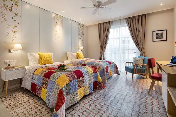 Tương đương với một phối cảnh mặt tiền như vậy thì không gian bên trong được bố trí khá xinh như thế này, mọi thứ vừa văn đủ để cho khách nghỉ cảm thấy dễ chịu khi ở trong không gian này. Hai chiếc giường đơn nhỏ với chiếc gối vàng nổi bật, cùng với chiếc chăn nổi bật trong không gian với tone màu kem trung tính. Một vài bức tường ở phía sau giường có dán giấy với họa tiết hoa lá nhẹ nhàng mang đậm không khí xuân trong không gian.