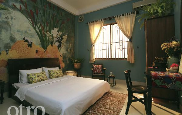 Một cách décor phòng khá ấn tượng trong xây dựng khách sạn tại Bình Thạnh để gia chủ tương lai tham khảo. Không gian phòng lựa chọn tone xanh đậm với một bức họa lớn ở phía đầu giường. Với một bức họa như thế này giúp cho người ta chìm đắm vào không gian thiên nhiên với những trí tưởng tượng đầy sắc màu. Đồ nội thất được lựa chọn trong không gian này với màu nâu trầm nổi bật, mang đậm phong cách Việt Nam thập niên 70, 80. Trong không gian này sử dụng cửa sổ để khi ánh mặt trời tắt chiếu rọi vào không gian là ánh nắng vàng ấm áp nhưng đủ khiến lòng người nao lòng.