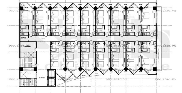 Phương án bố trí mặt bằng xây dựng khách sạn tại quận Bình Thạnh trên 1 diện tích khá lớn có bản vẽ như trên, có tổng cộng 16 phòng được bố trí trên diện tích trên, cầu thang máy và cầu thang bộ được bố trí riêng một góc để việc di chuyển thuận lợi nhất. Trong mỗi phòng đều được bố trí ban công để khách hàng có thể nhìn ngắm toàn thành phố.