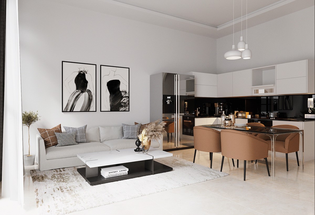 Đi vào bên trong, không gian thể hiện rõ với hình thức bố trí từ không gian mở. Tạo nên cho ngôi nhà sự thông thoáng vốn dĩ luôn cần sự hiện diện nhằm xóa đi các vách ngăn làm nhà trở nên bí bách. Gam màu chủ đạo phía trong được gia chủ sử dụng là trắng nên rất dễ trang trí. Chúng sẽ giúp đánh bật lên đồ dùng nội thất khi pha trộn. Phòng khách được nằm ngay vị trí bếp kết hợp một bàn ăn nhỏ dành cho 4 người. Nhà bếp được sử dụng phần tủ chữ L ôm trọn góc nhà giúp tiết kiệm không gian và vật dụng cũng được sắp xếp rất ngăn nắp. Giúp người phụ nữ trong gia đình có thể thuận tiện nấu những bữa cơm ấm cúng cho gia đình.