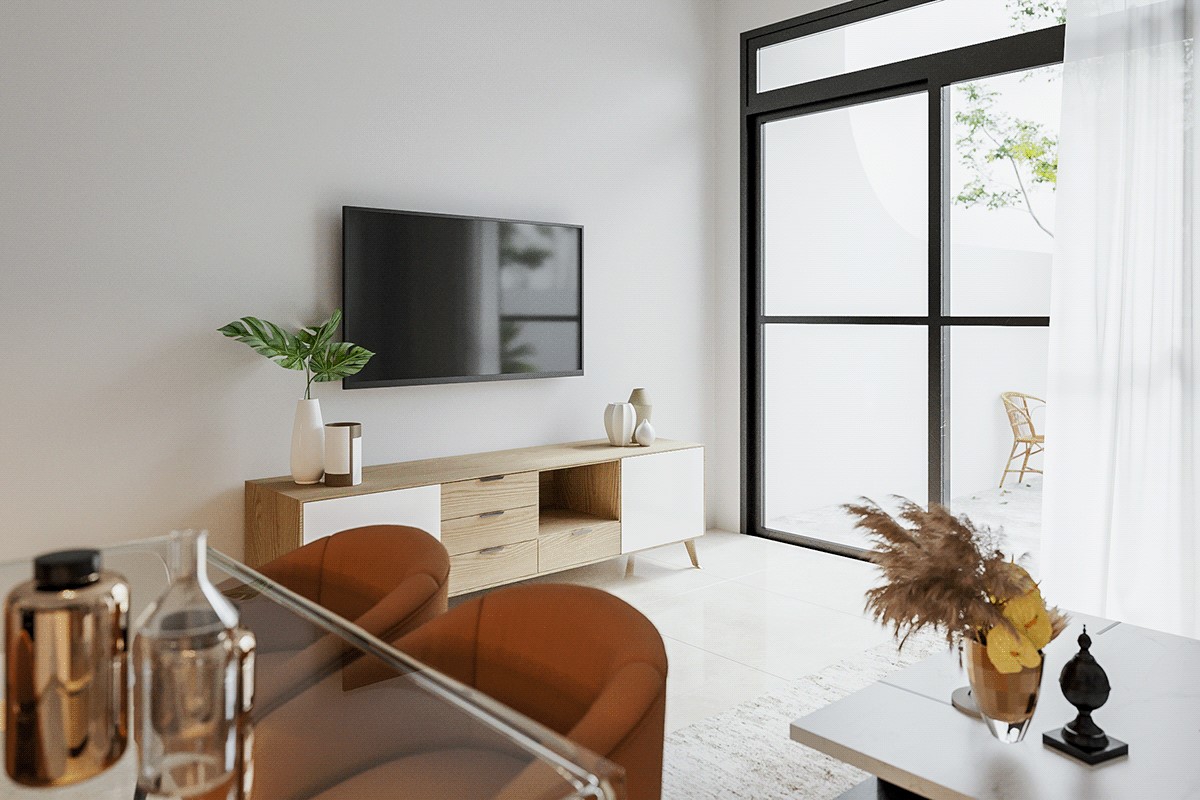 Phòng khách hiện đại, nhỏ gọn nhưng đầy đủ các thiết bị phục vụ cho việc sinh hoạt như Tivi, bàn, sofa, bàn, thảm lót sàn là nơi để các thành viên sinh hoạt. Là nơi giải lao hoàn hảo sau một ngày dài lao động và học tập bên ngoài. Đây cũng là một lời gợi ý dành cho các gia đình yêu thích sự gọn gàng, ngăn nắp không cần quá cầu kỳ nhưng vẫn thể hiện sự tinh tế bên trong ngôi nhà một cách cụ thể nhất.