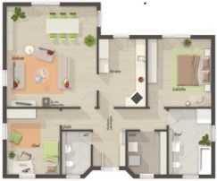 Dựa trên bản vẽ mà mọi người có thể thấy được nét tổng quan từ bố cục nội thất mà gia chủ hướng đến. Từ cửa chính ra vào là 2 gian phòng chứa các vật dụng, đồ dùng thiết yếu và nhà vệ sinh. Thông qua phần hành lang bên trái là phòng ngủ số 1 mà bạn có thể dùng cho các thành viên nhỏ trong gia đình. Thông qua cửa ra vào là một phòng khách rộng rãi kèm cho mình với một bàn ăn. Kế tiếp là nhà bếp nằm cạnh bên và phòng ngủ số 2. Kết cấu phụ phía bên ngoài là một sân sau nhằm tăng gian phòng chức năng cho ngôi nhà. Nhà có lối bài trí một cách khoa học hướng đến một sự tiện nghi, thuận lợi mà từ bàn tay tài hoa của kiến trúc sư mà chúng được khai thác một cách hiệu quả.