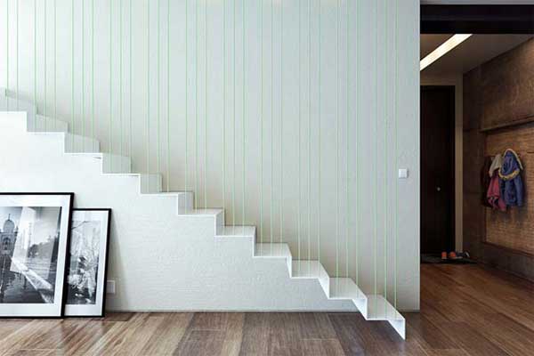 Đây là mẫu cầu thang hình chữ I độc đáo và ấn tượng cho những khu chung cư mini. Cầu thang được thiết kế từ kim loại kết hợp với gỗ, chia bậc độc và lạ, đảm bảo mang đến sự tiện lợi và cá tính cho không gian của bạn. Bậc cầu thang được thiết kế hở để tạo sự thoáng đãng cho ngôi nhà thay vì thiết kế bậc thang kín như nhiều mẫu khác. Vị trí đặt cầu thang cũng vô cùng phù hợp, và gọn gàng nên có thể tiết kiệm được tối đa không gian thiết kế.