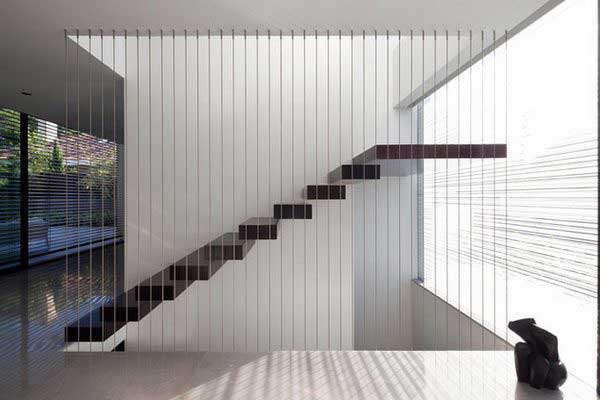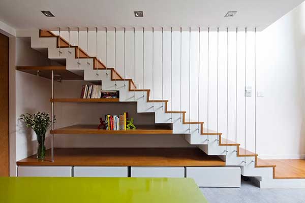 Nếu bạn là một người yếu thích đọc sách nhưng trong nhà của bạn lại quá nhỏ và không thể dành một phòng riêng cho những cuốn sách của mình thì đây chính là mẫu cầu thang chữ I đẹp mà bạn có thể tham khảo. Mẫu cầu thang đẹp này được thiết kế đơn giản, bậc cầu thang bằng bê tông, mặt gỗ và tay vịn bằng dây kim loại để tạo điểm nhấn cho ngôi nhà. Gầm cầu thang được thiết kế trở thành một giá sách linh hoạt, bạn có thể bày trí sách để nó trở thành một thư viện mini trong chính ngôi nhà của bạn.