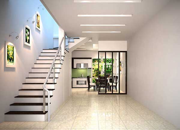 Vị trí cầu thang được đặt cạnh với phòng khách, dọc theo chiều dài của ngôi nhà vô cùng gọn gàng. Mẫu cầu thang chữ I có độ dốc vừa phải, phù hợp với ngôi không quá nhỏ. Các bậc cầu thang được làm từ gỗ với những đường vân gỗ tự nhiên, kết hợp với tay vịn bằng kính trong suốt vừa đảm bảo được yếu tố thẩm mỹ, vừa đảm bảo sự an toàn trong lúc di chuyển. Diện tích không quá lớn nhưng với cách sắp xếp khoa học từ cầu thang cho đến nội thất với màu sắc sáng tối đảm bảo cho không gian ngôi nhà luôn rộng và thoáng.
