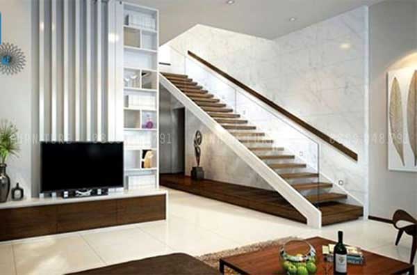 Thiết kế cầu thang chữ i với thiết kế độc đáo, bậc cầu thang với mặt gỗ giúp các thành viên trong gia đình di chuyển dễ dàng. Tay vịn sử dụng chất liệu kính họa tiết và gỗ càng khiến cho cầu thang trở nên thu hút hơn. Bên dưới cầu thang được thiết kế thành một căn phòng nhỏ, bạn có thể sử dụng nó làm nhà kho, bên ngoài thiết kế phòng khách đơn giản. Đây là mẫu mà bạn có thể tham khảo cho không gian nhà của mình.