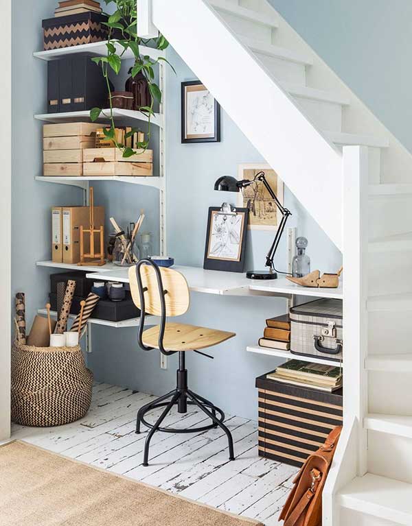 Phong cách cầu thang với kiểu dáng chữ L khá phổ biến trong những ngôi nhà có diện tích nhỏ. Đặc biệt là bạn có thể tận dụng phía dưới cầu thang để làm bàn làm việc, đọc sách hoặc để những đồ vật trang trí. Với gam màu trắng, vị trí cầu thang đặt dọc theo tường đảm bảo tiết kiệm diện tích một cách tối đa. Chất liệu gỗ công nghiệp cùng với kiểu dáng đơn giản nên có thể dễ dàng thi công, tiết kiệm diện tích và chi phí một cách tối đa.