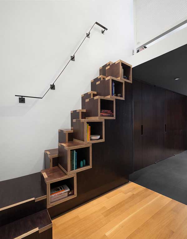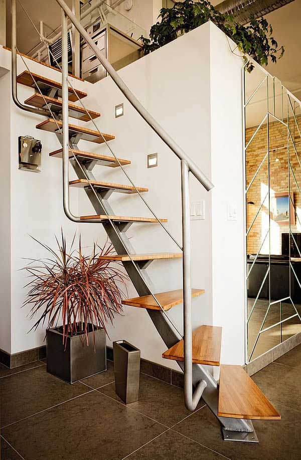 Bạn nghĩ sao nếu sử dụng mẫu cầu thang cho nhà nhỏ hẹp này? Hai vế cầu thang được thiết kế liền nhau với các bậc so le vô cùng độc đáo. Nó không chỉ tạo ra nét thu hút cho ngôi nhà mà còn đảm bảo cho hai người có thể đi song song với nhau cùng lên hoặc xuống. Nó hoàn toàn phù hợp với việc liên kết giữa không gian tầng dưới với tầng gác xép. Bạn có thể sử dụng cầu thang bằng gỗ, tận dụng cầu thang trở thành tủ đựng đồ hoặc khu vực trang trí cũng rất độc đáo và thu hút. Tay vịn cầu thang bằng kim loại được gắn trực tiếp vào tường nhằm tiết kiệm diện tích tiếp xúc với bề mặt, là một cách để tạo nên sự phóng khoáng cho ngôi nhà.