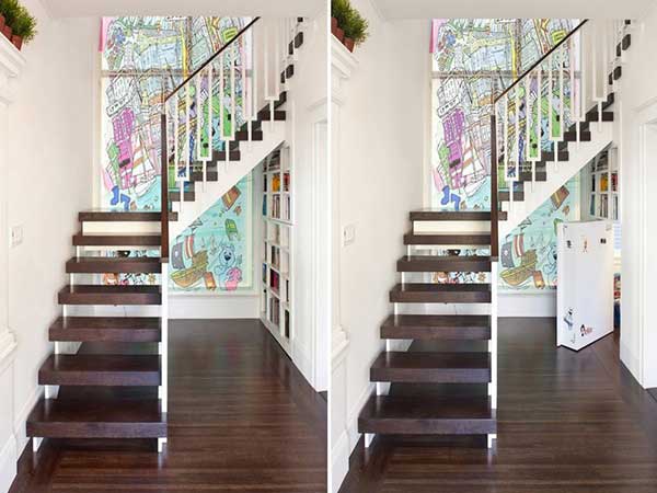 Điểm nhấn của mẫu cầu thang cho nhà nhỏ hẹp này đó là background sử dụng trong ngôi nhà. Một bức tranh ngộ nghĩnh với màu sắc tươi vui, kết hợp với những bậc cầu thang gọn gàng, dứt khoát tạo nên một bức tranh nghệ thuật ngẫu hứng và sáng tạo. Bên dưới cầu thang bạn có thể sử dụng làm tủ sách, hoặc cũng có thể là một cánh cửa để dẫn đến một gian phòng khác.