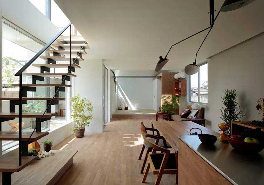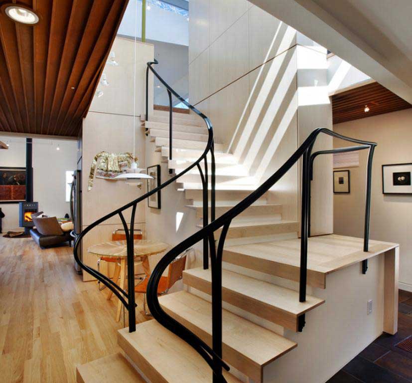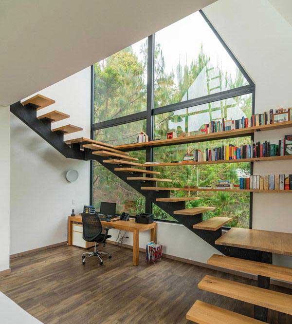 Thiết kế cầu thang trong mẫu nhà này vô cùng đa năng khi vừa có thể làm kệ sách, vừa tận dụng được không gian để đặt bàn làm việc. Được đạt ở vị trí cạnh cửa kính lớn để kết hợp với không gian làm việc, thư giãn nên thiết kế cầu thang hở bậc và không có thanh che chắn . Vì không có thanh che chán nên cầu thang được chia ra thành nhiều nhịp hơn để giảm độ dốc. Đây là một sự lựa chọn hoàn hảo nếu tất cả các thành viên trong gia đình đều là người trưởng thành.