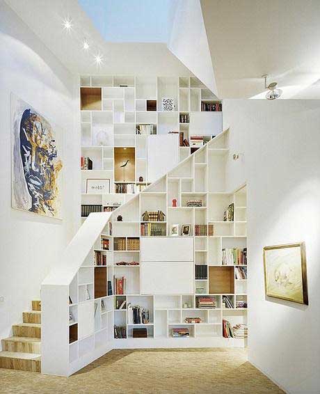 Đây là một thiết kế hiện thực hóa ý tưởng nếu bạn muốn trong chính ngôi nhà của bạn có một thư viện sách khổng lồ giống như ở bảo tàng nghệ thuật tri thức. Tận dụng vị trí đặt cầu thang để thiết kế, ý tưởng này đã biến chi tiết cầu thang đơn giản trở nên vô cùng ấn tượng. Khi bước đi trên từng nhịp thang, bạn sẽ đều có cảm giác sở hữu và tận hưởng kho tàng tri thức nghệ thuật đó.