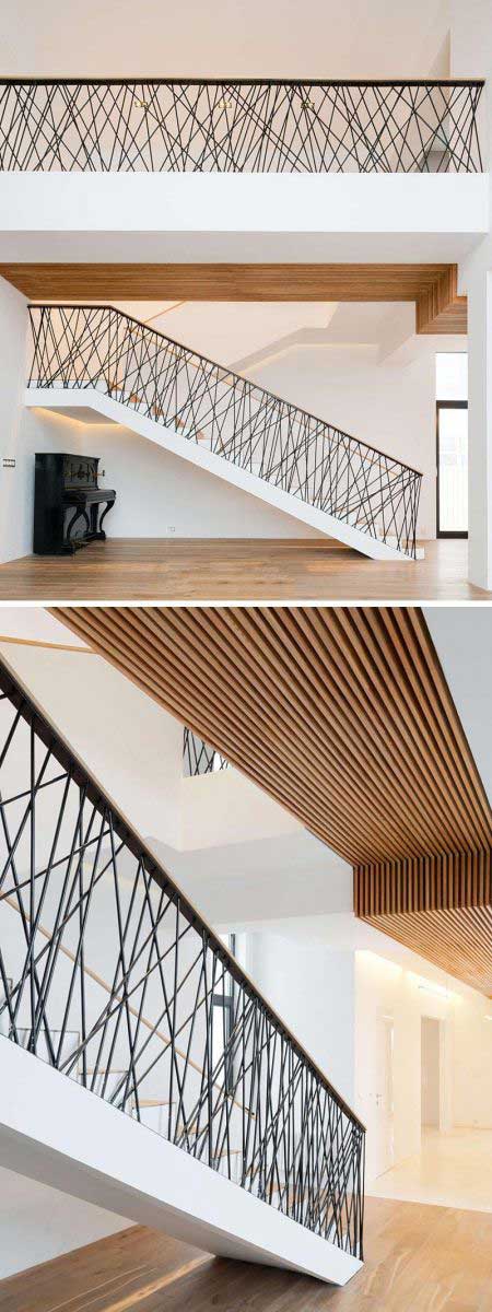 Với thiết kế nhà ở không bị hạn chế về không gian và diện tích thì sự lựa chọn mẫu cầu thang đẹp-độc đáo trở nên vô cùng dễ dàng. Nếu bạn yêu thích sự khác biệt đơn giản nhưng hiệu quả ấn tượng vẫn sâu sắc thì đây là một gợi ý đáng được lưu tâm. Do không bị hạn chế về không gian nên cầu thang trong thiết kế nhà này có kích thước khá lớn và chia thành hai nhịp dài, đều nhau với điểm nhấn là thanh che chắn có kết cấu từ các song chéo ngẫu hứng. Trong tổng thể thiết kế góc cạnh sử dụng tone màu trắng-nâu thì thiết kế cầu thang với thanh chắn sắp xếp đầy ấn tượng tạo hiệu quả thẩm mỹ tuyệt đối.