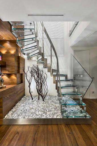 Lấy cảm hứng từ hoa tuyết và những viên pha lê, đây là một mẫu thiết kế cầu thang đặc biệt khác tạo cảm giác tinh khôi, lấp lánh cho ngôi nhà của bạn. Các bậc cầu thang được thiết kế kín kết hợp với chất liệu kính trong suốt tạo cảm giác góc cạnh, đa chiều. Người thiết kế còn rất sáng tạo khi thiết kế tiểu cảnh bên dưới với những viên sỏi trắng lại càng nhấn mạnh cảm giác thi vị như bạn dạo chơi trên đá, trên tuyết.