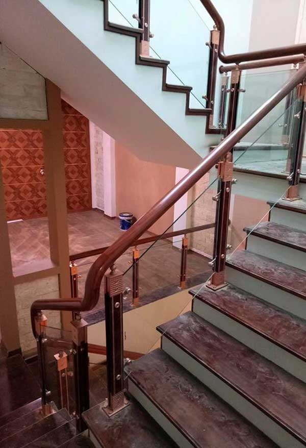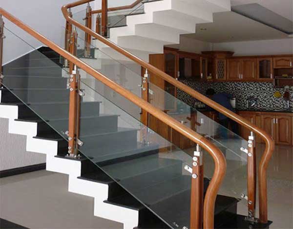 Nếu bạn đã quá quen với những lan can cầu thang được sử dụng bằng inox phủ sơn đen hoặc trắng sáng bóng hãy thử với sự kết hợp độc đáo giữa inox- kính cường lực – nhựa. Ba loại vật liệu trên sẽ giúp cho không gian của bạn trở nên thêm phần đặc biệt. Bởi đặc tính trong suốt của kính sẽ giúp cho không gian của bạn có cảm giác được liên kết với nhau mà không hề có bất cứ vách ngăn hay sự ngăn cách nào ở giữa. Thêm vào đó những kết nối giữa những vách kính làm bằng inox phủ sơn giả gỗ kết hợp cùng tay vịn nhựa phỉ film đồng màu giả vân gỗ sẽ làm cho không gian của bạn thêm phần sang trọng, tinh tế hơn.
