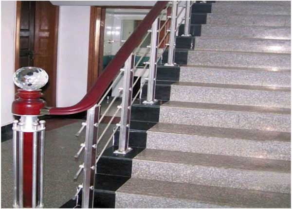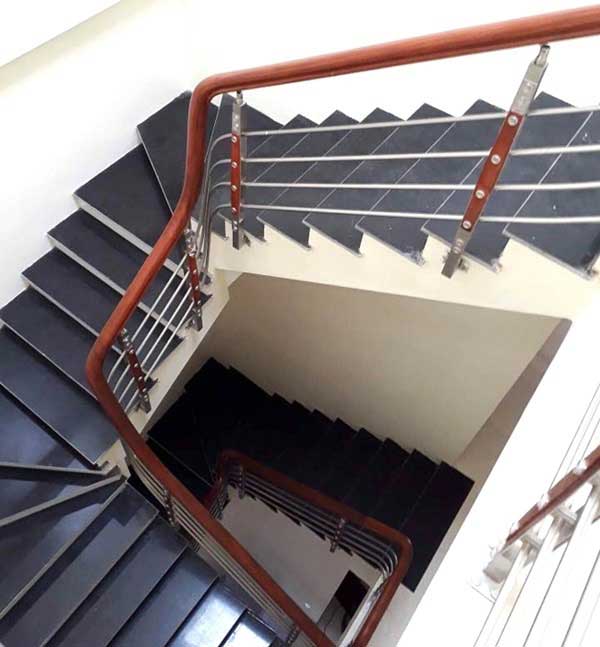 Cầu thang inox tay vịn nhựa được phủ film giả gỗ, kết hợp với bậc cầu thang ốp đá granite tạo vẻ sang trọng, lịch sự cho không gian trong nhà mà vẫn giúp cho phần thiết kế của ngôi nhà trở nên thông thoáng không hề bị bí bách. Sự kết hợp tuyệt vời giữa những vật liệu nhân tạo và vật liệu tự nhiên tạo nên vẻ đẹp tuyệt vời vừa thanh khiết vừa lịch sự, vừa mang hơi hướng tự nhiên mà không kém phần hiện đại.