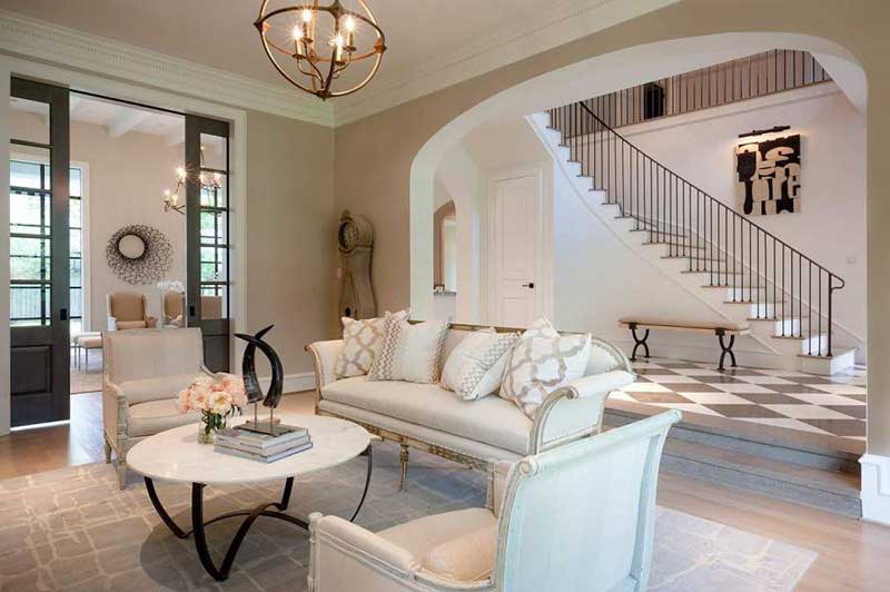 Đối với nhà phố, nhà ống thì phòng khách thường được đặt ở tầng 1 để thuận tiện cho việc di chuyển và tiếp đón khách. Với không gian hẹp ngang thiên về chiều sâu nên trong bài trí nội thất tân cổ điển thường hướng đến sự nhẹ nhàng, đơn giản mà vẫn tinh tế và vẫn không mất đi sự sang trọng quý phái của tổng thể chung. Phòng khách này mang phong cách tân cổ điển với tông màu tối áp dụng cho bộ bàn ghế sofa, bức tường được ốp đá cẩm thạch rất sang trọng, khuôn viên ngay dưới gầm cầu than mang lại nét đẹ tự nhiên cho căn phòng.