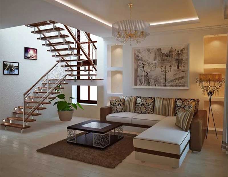 Thiết kế phòng khách chứa thêm cầu thang đòi hỏi các nhà thiết kế phải bố trí và sắp đặt nội thất trong phòng phải đạt đến sự tinh tế. Với những chiếc cầu thang nhỏ bạn có thể đặt sát tường phía sau bộ ghế sofa để không làm cản trở lối đi và làm tốn diện tích phòng. Thiết kế nội thất sao cho tạo được điểm nhấn thu hút thị giác kết hợp với cầu thang để tạo sự nổi bật cho phòng khách.