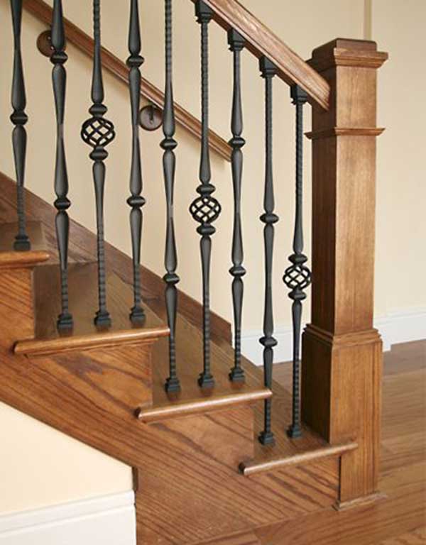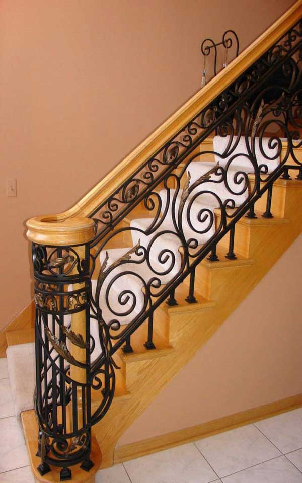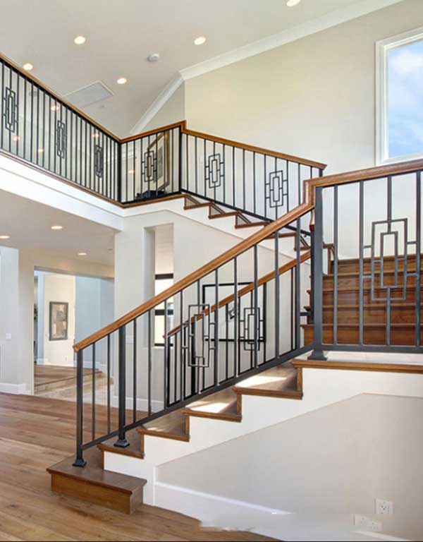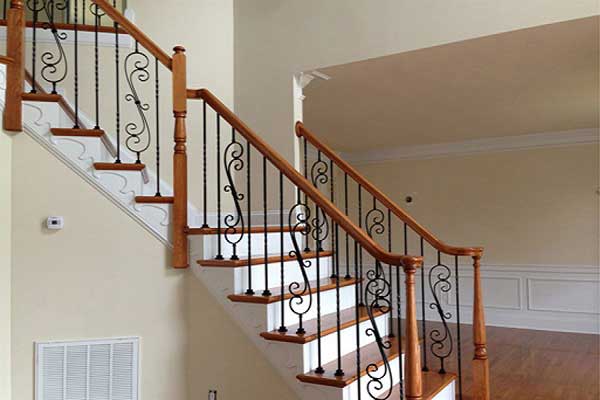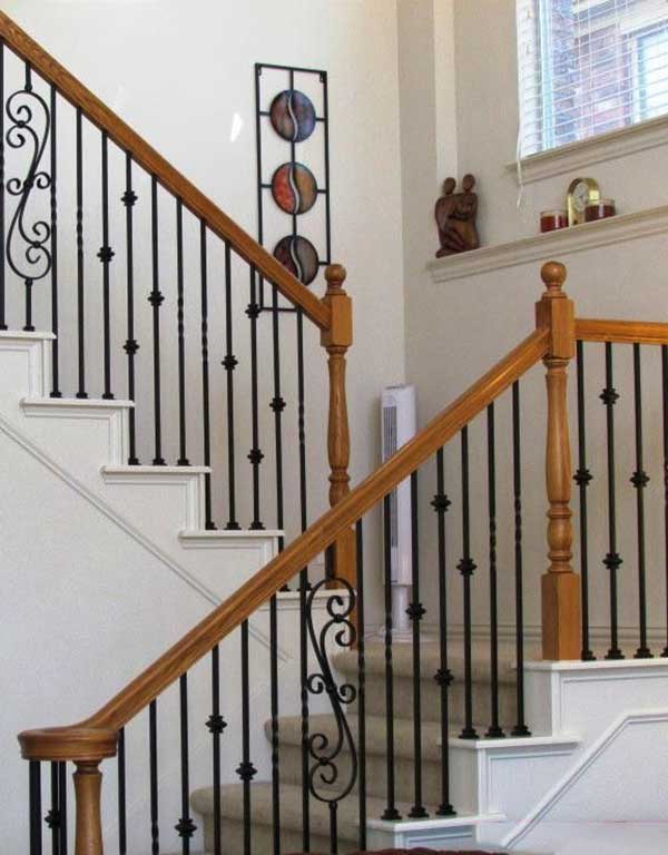 Các mẫu cầu thang tay vịn gỗ với phần sắt được uốn nghệ thuật cũng rất phổ biến. Lan can sắt nghệ thuật này tạo sự phá cách, ra khỏi khuôn mẫu cứng nhắc gò bó mà mang đến sự mềm mại cho không gian. Sắt đặc vuông được uốn thành hình hoa văn, là điểm nhấn vô cùng thu hút.