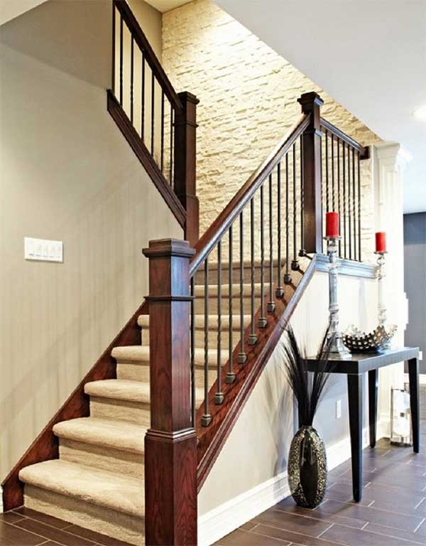 Mẫu cầu thang sắt tay vịn gỗ này chú ý đến chất liệu hơn là kiểu dáng, nhưng xét về tổng thể, vẫn đảm bảo tính thẩm mỹ cũng như chức năng của cầu thang. Có thể thấy rõ ràng rằng, chỉ cần đơn giản vẫn có thể tạo nên điểm nhấn.