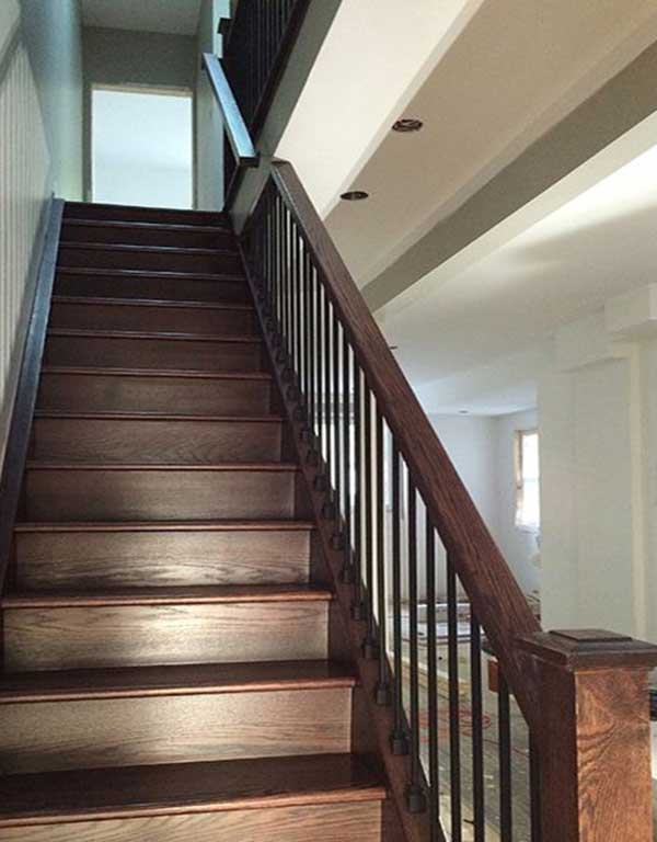 Tay vịn cầu thang sử dụng chất liệu gỗ cao cấp với màu sơn sang trọng. Thiết kế các thanh trụ sắt liên kết trực tiếp vào bậc thềm rất nhã nhặn, tỉ mỉ. Đẹp và nổi bật hơn cả là những đường nét hoa văn được rèn uốn, đo đạc cẩn thận và chuẩn khớp. Mẫu cầu thang sắt tay vịn gỗ này thiên về sự tỉ mỉ, chuyên nghiệp và chặt chẽ.