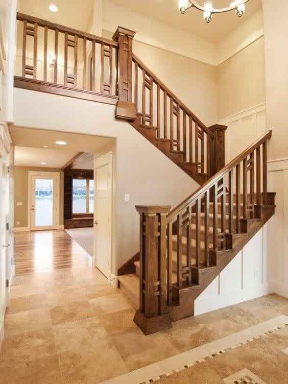 Và đây là một mẫu lan can dành cho ngôi nhà có diện tích rộng rãi. Nhìn vào hình ảnh này các bạn có thể thấy một không gian lớn của căn nhà. Bởi vậy các bạn có ý định tìm cho mình mẫu cầu thang rộng, thoáng và vô cùng sang trọng thì đưng lên bỏ qua mẫu cầu thang này của chúng tôi. Mẫu lan can nay được thiết kế bằng những thanh gỗ đứng ngăn cách nhau và điểm thêm vài thanh gỗ ngang để thêm phần chắc chắn cho lan can. Bên cạnh phần trang trí của lan can chúng ta phải nói đến màu sắc của vân gỗ đây chính là màu nâu tây cổ xưa sang trọng được rất nhiều người ưa chuộng .