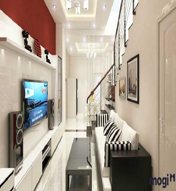 Trong một không gian hạn chế về chiều rộng, thiên về chiều dài thì không chỉ phòng khách được thiết kế theo lối tiết kiệm không gian với một bộ bàn ghế salon màu trắng sáng, kệ tivi sáng bóng gọn gàng. Theo đó với sự tiết kiệm về không gian phòng khách thì cầu thang cũng được thiết kế theo lối tiết kiệm diện tích, hình cầu thang thẳng với kính cường lực đã góp phần làm lên nét đẹp độc đáo cho ngôi nhà.