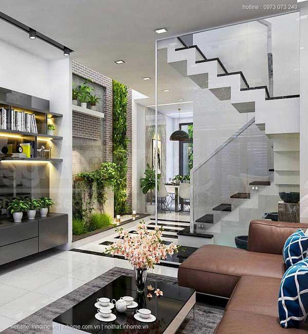 Đến với mẫu thiết kế này khi bước vào căn nhà này chúng ta bị hút hồn ngay từ cái nhìn đầu tiên không chỉ bởi mẫu phòng khách ấn tượng mà còn bởi lối thiết kế thông minh của cầu thang. Để tận dụng diện tích thì gầm cầu thang đã được thiết kế tiết kiệm khi sử dụng làm kệ sách gọn gàng. Trước khi bước lên tầng 2 ở chân cầu thang đã được thiết kế với một khoảng không trồng nhiều cây xanh khiến cho cho con người gần gũi, gắn bó với tự nhiên hơn.