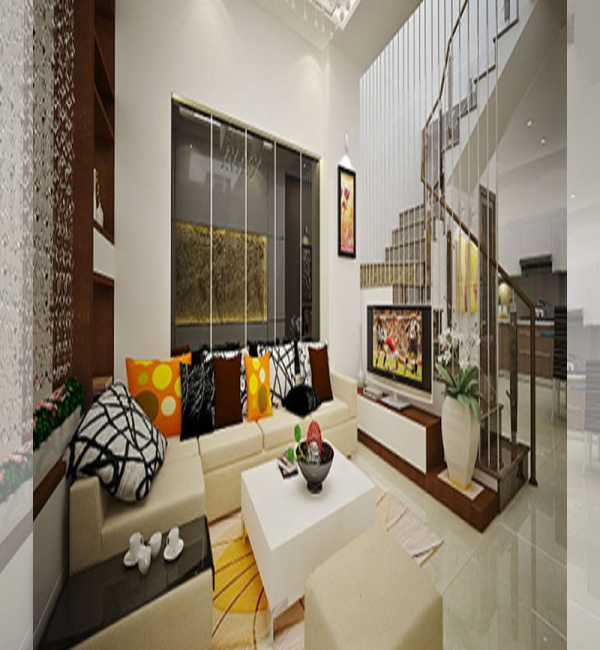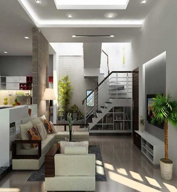 Để tiết kiệm không gian một cách tối ưu nhất thì chúng ta thấy ở mẫu phòng khách này mẫu cầu thang được thiết kế men theo căn phòng khách vừa tạo nên sự gắn bó, hài hòa vừa khiến cho căn phòng với diện tích hạn chế không hề có cảm giác chật trội khi gia đình bạn ở trong căn nhà này.