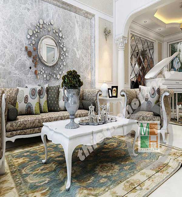 Một phòng khách với vẻ đẹp kiêu sa. Mọi đồ vật trong căn phòng này được kết hợp hài hòa, đan xen với nhau tạo nên một vẻ đẹp tuyệt mĩ. Bộ bàn ghế salon với màu sắc, hoa văn cổ điển tinh tế hòa cùng với chiếc bàn trà trắng mang đến một vẻ đẹp vô cùng sang trọng hiện đại và quyền quý. Nhưng điểm nhấn nổi bật nhất của căn phòng này là bức tường với chi tiết hoa văn, mới lạ, độc đáo.