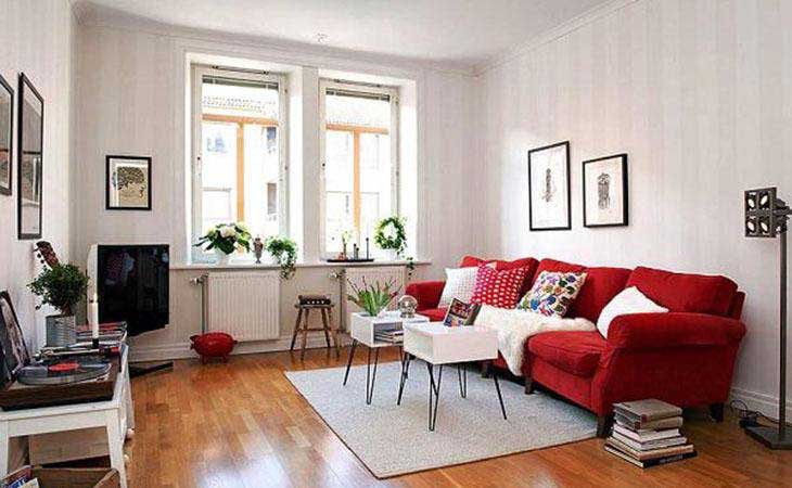 Màu đỏ rực rỡ là điểm nhấn của toàn bộ căn phòng này. Mẫu thiết kế phòng khách nhà ống 3m này sử dụng toàn bộ đồ nội thất có đường nét mảnh và kích cỡ mini và chỉ chiếm một phần diện tích nhỏ của cả căn phòng. Bởi bộ sofa màu đỏ nổi bật đã hoàn thiện nét độc đáo mà không tạo cảm giác ngột ngạt cho căn phòng có không gian nhỏ hẹp.