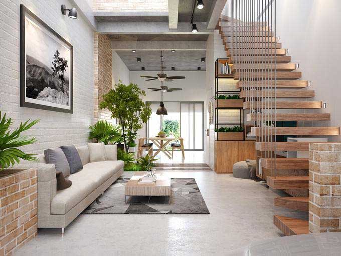 Một mẫu thiết kế phòng khách nhà ống 3m gần gũi với thiên nhiên khi sử dụng nhiều cây xanh và dùng màu gạch tự nhiên để trang trí trần, tường nhà. Bộ sofa, đèn chiếu sáng cũng được lựa chọn tối giản nhất để làm nổi bật kiến trúc thiết kế nhiều hình khối của cầu thang và tường trần, cửa kính lớn toàn bộ mặt tiền kết nối không gian sinh hoạt chung với thiên nhiên gần gũi. Bức tranh tường tone màu trắng-đen hoàn thiện nét mộc mạc của tổng thể thiết kế.