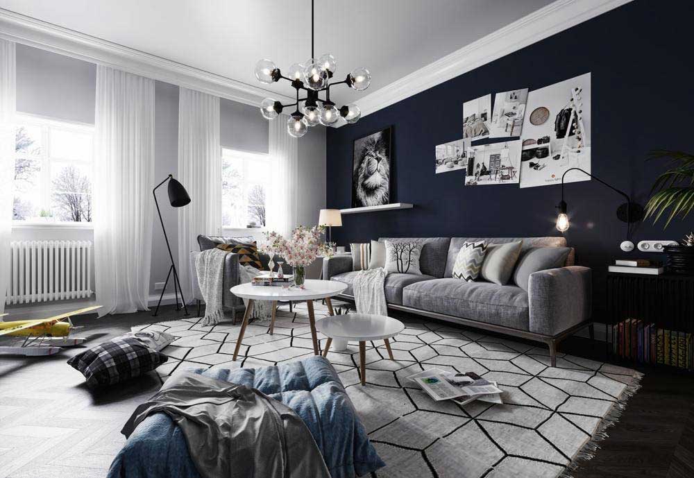 Một thiết kế phòng khách nhà ống 3m theo phong cách Bắc Âu hiện đại và sang trọng. tone màu trắng-xanh xám chủ đạo được sắp xếp vô cùng ấn tượng khi được sáp gấp liền kề để tạo hiệu ứng chuyển màu. Khác với các thiết kế phòng khách thông thường, mẫu thiết kế này sử dụng sàn nhà làm không gian sinh hoạt chủ yếu khi dùng nhiều thảm, gối ngồi để trang trí. Họa tiết của tranh treo tường được lựa chọn hài hòa với tổng thể không gian, tất cả tạo nên phong cách hiện đại, sang trọng tuyệt đối.