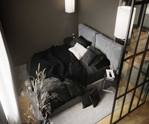 Mẫu phòng ngủ tông trầm cực sang. Ga và gối sử dụng gam màu tối như đen, xám kết hợp với chất liệu nhung làm cho căn phòng ngủ 11m2 này thêm phần ấm cúng. Việc kết hợp với các đèn chùm thả xuống khiến không gian phòng vô cùng ấn tượng và hiện đại. Một cô gái trẻ cá tính hay một chàng thanh niên tinh tế thì không nên bỏ qua thiết kế nội thất của căn phòng ngủ 11m2 này đâu nhé.