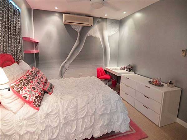 Đây đích thị là một căn phòng màu hồng dành cho các nàng công chúa bé nhỏ của gia đình. Mẫu phòng ngủ diện tích 11m2 này có sử dụng giường chứa ngăn kéo và mẫu tủ đứng uốn lượn theo bờ tường, đó là sự khéo léo kết hợp nội thất giúp cho căn phòng thêm sáng sủa và gọn gàng. Các tủ sách được thiết kế gắn với bờ tường vừa tiện lợi cho chủ nhân căn phòng vừa làm cho căn phòng tiết kiệm được diện tích hơn.