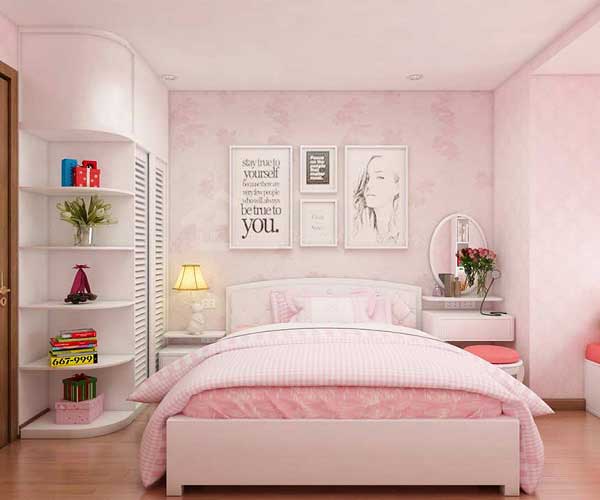 Một cô nàng độc thân thì không nên bỏ qua mẫu phòng ngủ 11m2 màu hồng này. Vô cùng ấn tượng và thích mắt, không gian tuy nhỏ nhưng với tông màu sáng thì tổng thể vẫn thoáng mát. Các kệ tủ và đồ trang trí hòa hợp ăn ý với nhau.