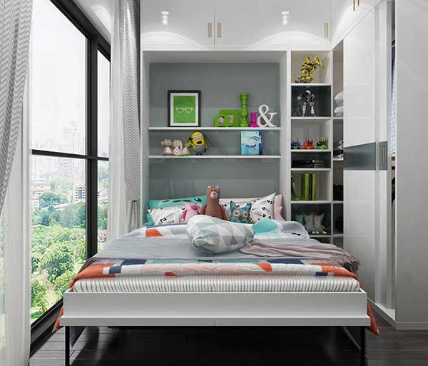 Đây sẽ là một mẫu phòng ngủ chung cư mà bạn có thể sử dụng cho các thành viên nhí trong gia đình. Không gian vời giường ngủ đơn giản, sáng sủa nhờ hệ thống cửa sổ lớn, và trang trí bằng những nhân vật hoạt hình ngộ nghĩnh chắc chắn sẽ khiến các con của bạn yêu thích. Những mẫu nội thất tủ thông minh được lắp đặt ẩn trong tường là cách hiệu quả giúp bạn tiết kiệm diện tích cho căn phòng mà vẫn vô cùng tiện nghi và thẩm mỹ.