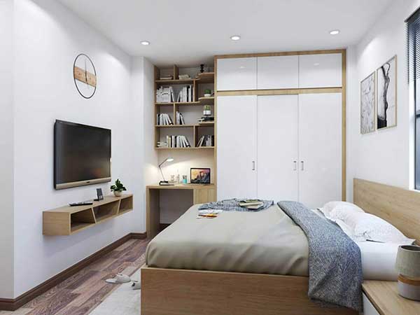 Với những không gian chung cư nhỏ, đây sẽ là mẫu phòng ngủ chung cư mà bạn có thể tham khảo. Mẫu phòng ngủ này ấn tượng với sự sắp xếp không gian vô cùng khoa học. Giường, tủ, bàn làm việc, ti vi… tất cả đều được sắp xếp gọn gàng, giúp bạn có thể tận hưởng không gian riêng tư một cách thoải mái nhất. Lựa chọn gam màu trắng để giúp không gian trở nên sáng và rộng hơn.