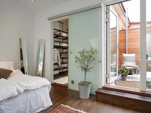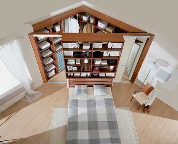 Chắc hẳn nhiều người sẽ phải trầm trồ thán phục khi nhìn mẫu thiết kế này bởi kiến trúc sư đã vô cùng sáng tạo khi đặt khu thay đồ vào góc ngôi nhà, khắc phục được nhược điểm lớn nhất của mọi căn phòng. Việc thiết kế phòng thay đồ bám sát bờ tường tạo thành hình tam giác đã tạo nên không gian thay đồ kín đáo mà không tốn quá nhiều công sức hay nội thất che chắn thêm. Chiếc giường được đặt ở vị trí này cũng khá mới lạ, khiến căn phòng cân đối, điểm cộng cho thiết kế này chính là có thể tận dụng tối đa ánh sáng tự nhiên làm cho căn phòng thoáng đãng hơn.