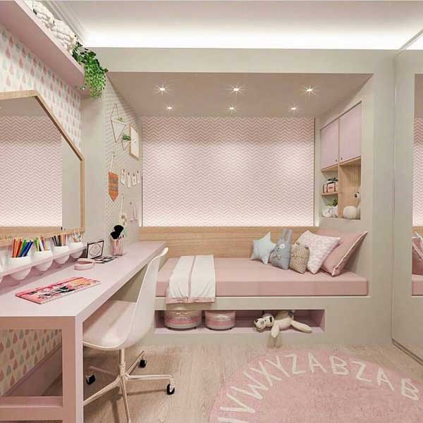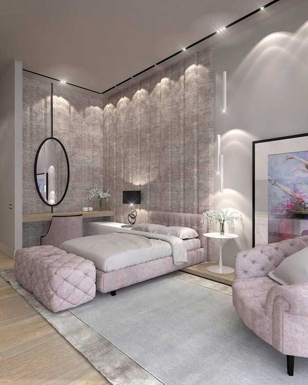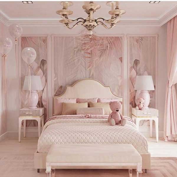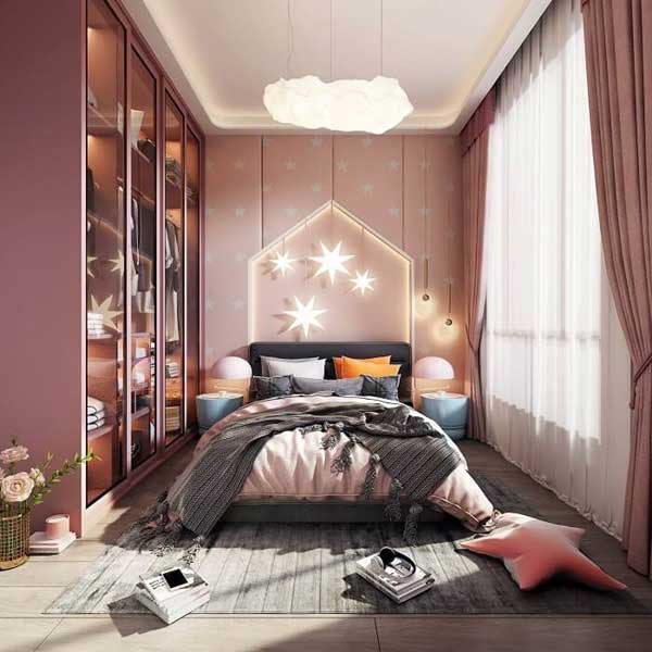 Màu hồng sẽ giúp cho không gian phòng ngủ của bạn trở nên nhẹ nhàng và hấp dẫn hơn, nó mang màu sắc của mây hồng trong tưởng tượng của các cô nàng yêu màu hồng, thường ngắm nhìn những áng mây trên bầu trời và nghĩ rằng chúng màu hồng. Khi kết hợp với đèn trùm và ánh sáng trắng sẽ tạo cảm giác nhẹ nhàng tinh khiết để các cô nàng có giấc ngủ sâu hơn và dễ dàng hơn.