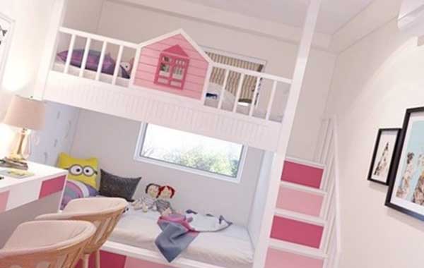 Nếu sự đơn giản không phù hợp với cá tính của hai nàng công chúa nhà bạn thì hãy thử gợi ý này của chúng tôi nhé! Màu hồng phấn sơn tường kết hợp cùng nội thất phòng ngủ có sự đan xen giữ màu trắng, hồng sẽ là một gợi ý hoàn hảo cho các bậc cha mẹ đang tìm kiếm thiết kế phù hợp với màu sắc sơn tường của mình chắc chắn sẽ là một gợi ý tuyệt vời. Những khu vực được thiết kế đan xen màu trắng hồng làm nổi bật nên không gian căn phòng ngủ của các bé, ngoài ra nó còn là điểm nhấn gây chú ý cho các đối với các khu vực cần chú ý trong phòng như: thành gường, mép bàn hay cầu thang….