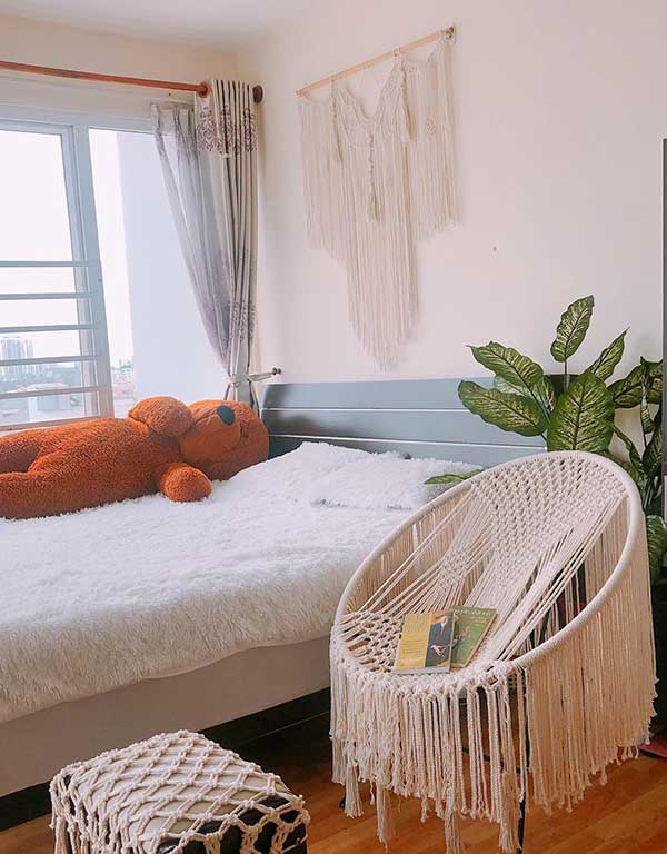 Điểm nhấn của mẫu phòng ngủ nhà cấp 4 này là những vật dụng trang trí macrame (macrame: nghệ thuật thắt dây sử dụng các nút thắt đơn giản để tạo thành họa tiết trang trí hoặc sản phẩm phù hợp với công năng mà con người cần). Cách làm những vật dụng này rất đơn giản, nguyên liệu lại dễ kiếm. Do đó, bạn hoàn toàn có thể thỏa sức sáng tạo những vật dụng theo ý thích của mình, vừa tiết kiệm lại rất độc đáo.