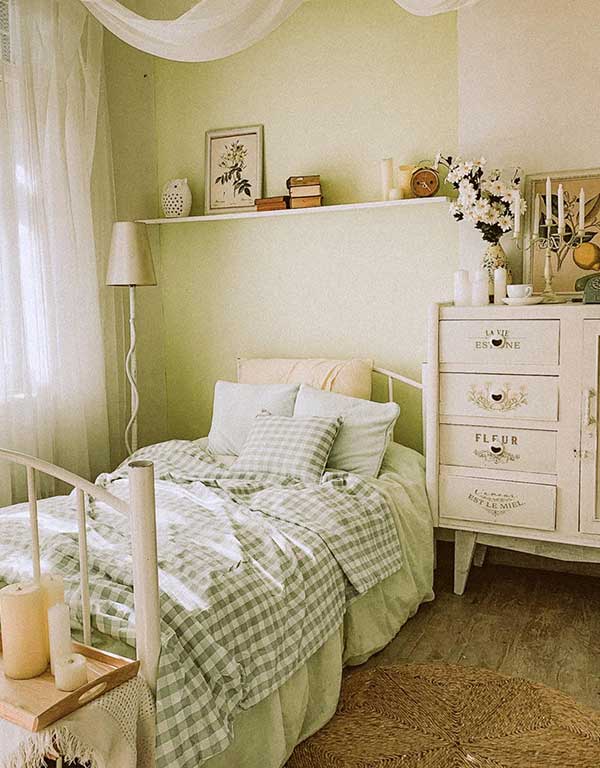 Căn phòng ngủ xinh xắn như một studio này thích hợp với những bạn thích “sống ảo”. Các màu sắc chăn, gối, kệ, tủ và trang trí khéo léo biến không gian nhỏ bé này trở nên xinh xắn, đáng yêu, tràn ngập sự ấm áp và thoải mái, dễ chịu.