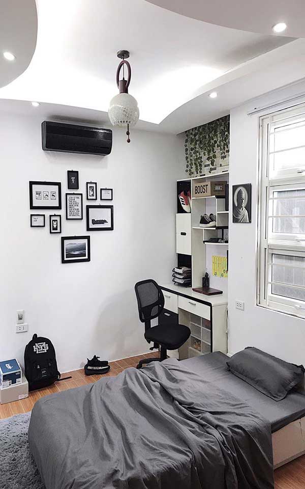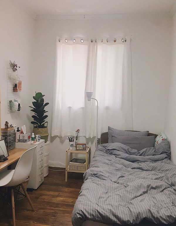 Mẫu phòng ngủ này tích hợp thêm cả không gian học tập, cực thích hợp với những người “độc thân”. Căn phòng này giúp ta tập trung cao độ cho việc đọc sách, học tập hay kể cả làm việc. Mặc dù diện tích phòng không quá rộng, nhưng việc trang trí thêm chậu cây, kệ đặt đồ, lưới decor giúp tổng thể rất thoải mái.